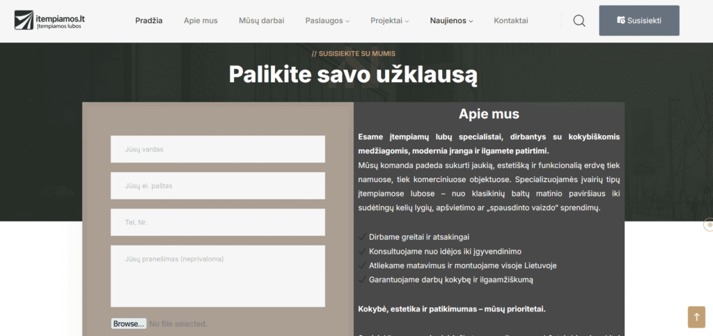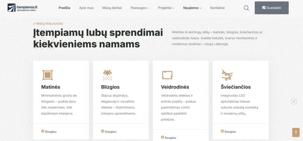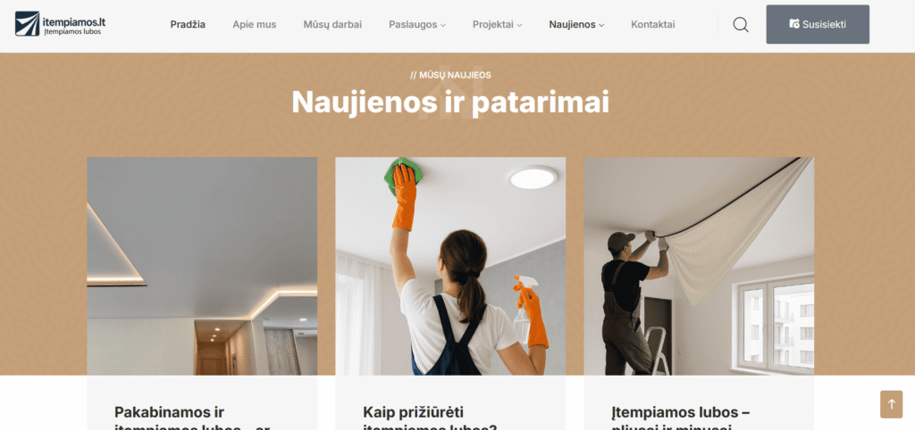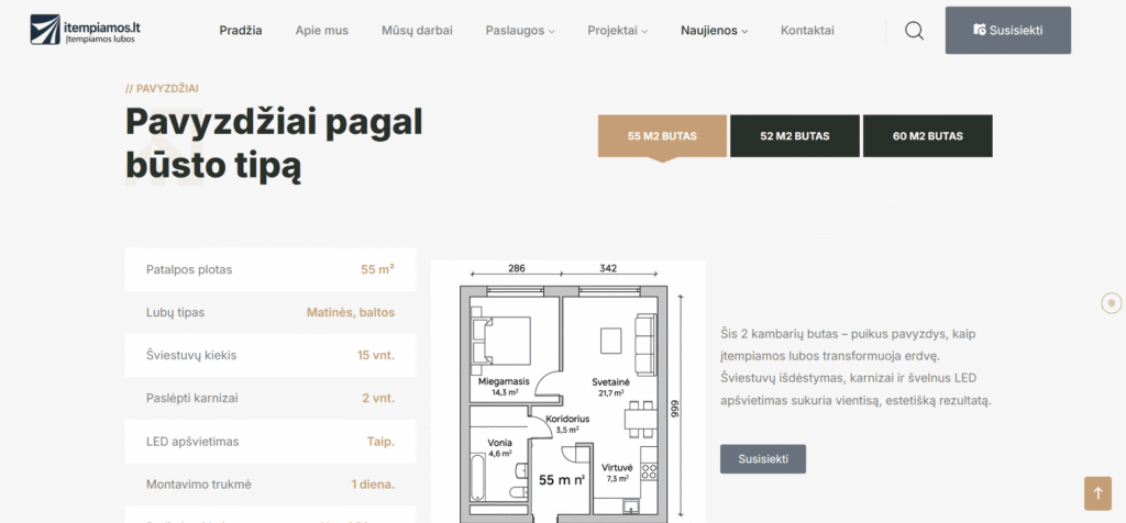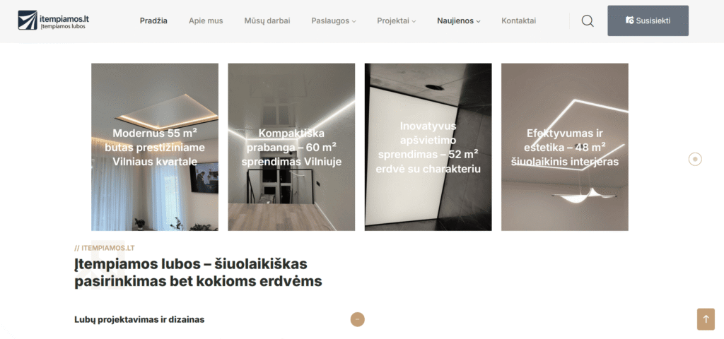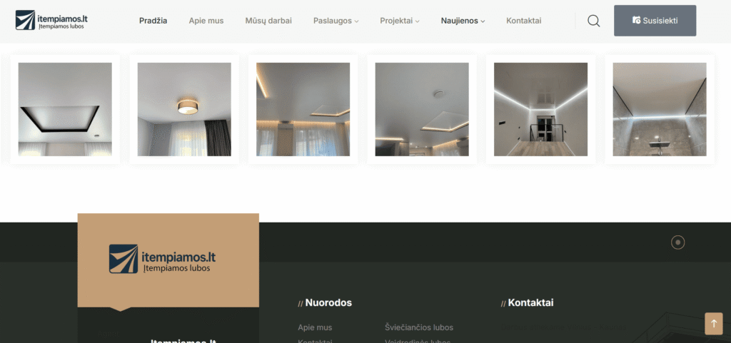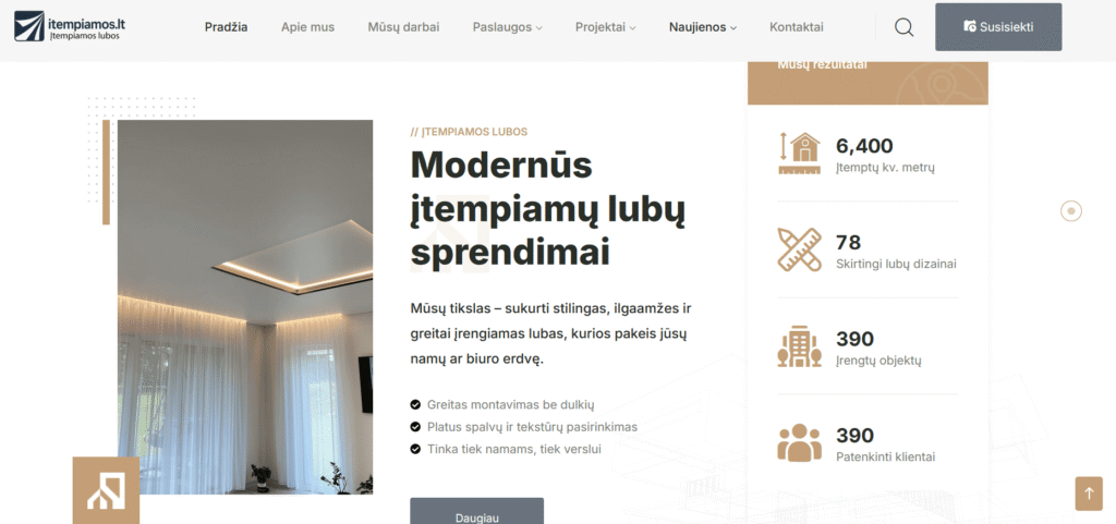 Svetainė sukurta tam, kad šiuolaikiškai ir patraukliai pristatytų įtempiamų lubų paslaugas. Projektą pradėjome nuo aiškios struktūros sudėliojimo – kad lankytojai galėtų greitai rasti visą reikalingą informaciją: paslaugų aprašymus, dizaino galimybes, atliktus darbus bei kontaktus.
