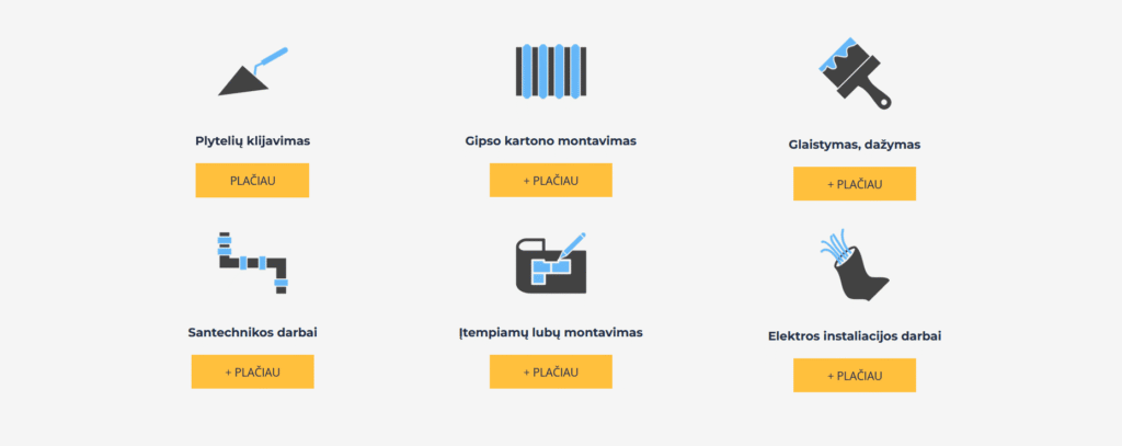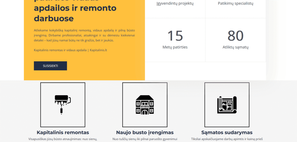 Svetainėje išskirtos pagrindinės paslaugų sritys: vidaus apdaila, kapitalinis remontas, plytelių klijavimas, gipso kartono montavimas, elektros instaliacija ir santechnikos darbai. Kiekviena paslauga aprašyta atskirai, kad lankytojai galėtų greitai suprasti darbų pobūdį ir pasirinkti jiems aktualią sritį.