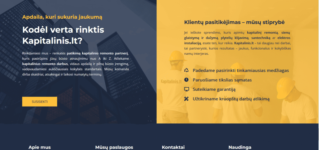 Svetainė sukurta tam, kad aiškiai ir profesionaliai pristatytų vidaus apdailos bei kapitalinio remonto paslaugas. Pagrindinis projekto tikslas buvo suteikti potencialiems klientams visą reikiamą informaciją apie įmonės teikiamus darbus, kainas, procesus ir užtikrinti patogų būdą pateikti užklausas.